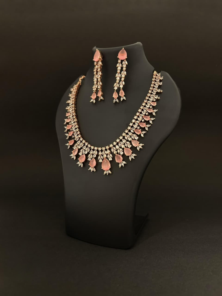 Shine with elegance in this breathtaking necklace and earring set, crafted with sparkling diamond-cut stones and soft pink teardrop accents. The intricate design blends modern glamour with timeless charm, making it the perfect choice for weddings, receptions, parties, and festive occasions.